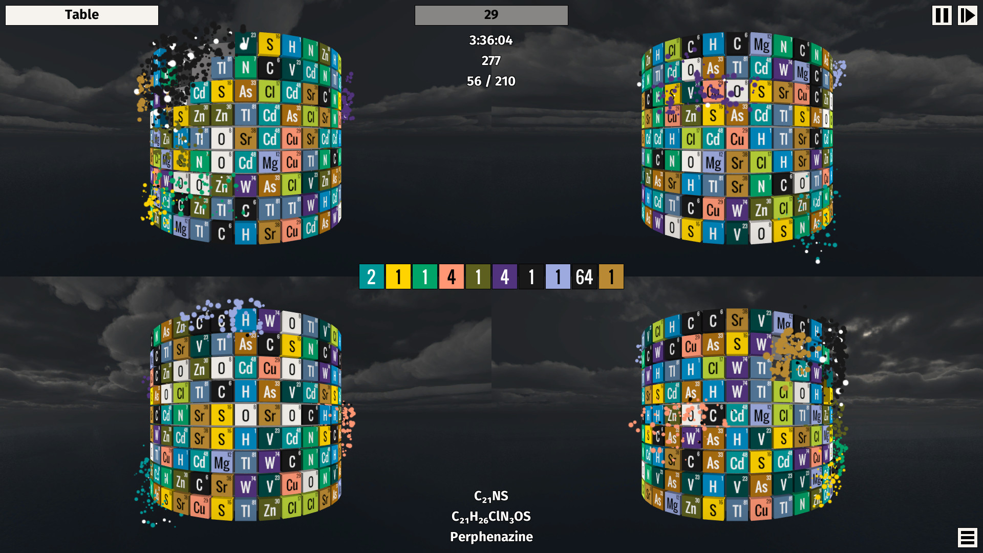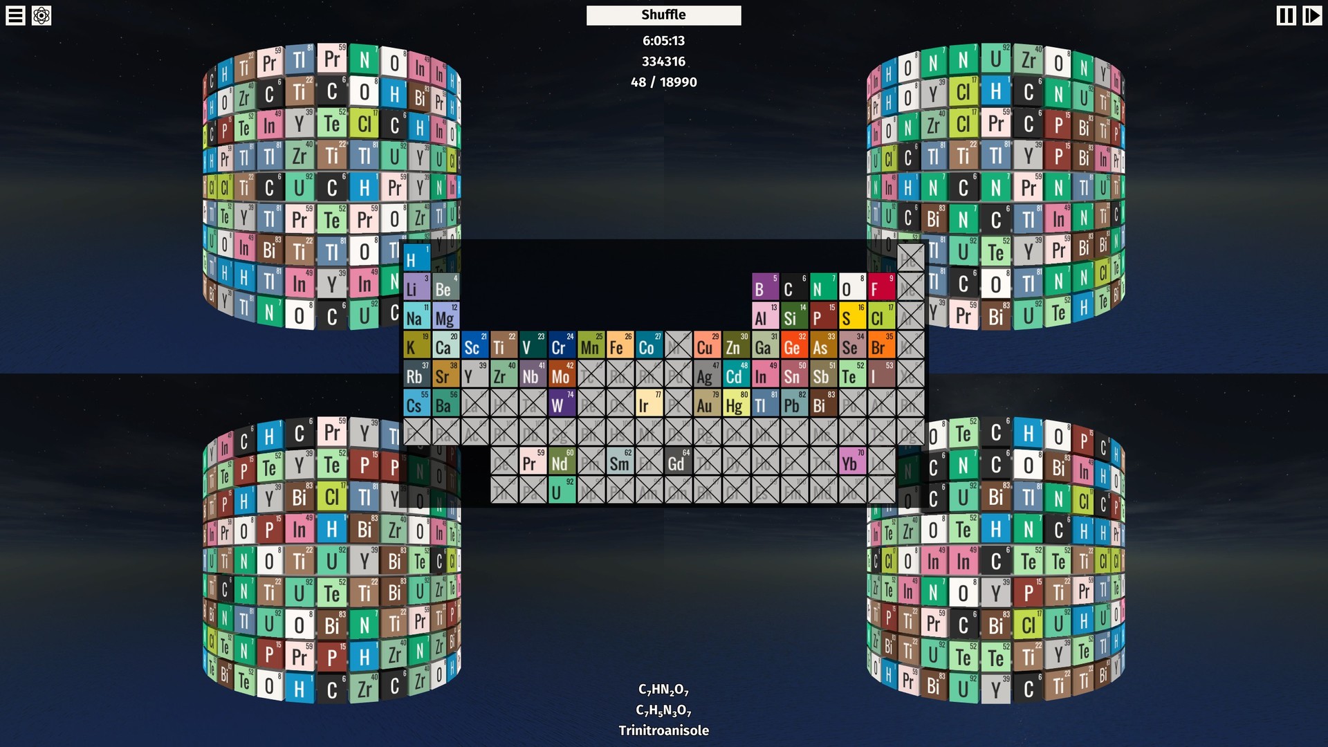 Так как многим интересно, как же всё-таки работает игровая механика, вот краткое объяснение. У вас есть одна головоломка и четыре вида на неё с разных сторон, чтобы вы могли видеть всю головоломку целиком. Вы можете поменять местами два соседних блока по вертикали, либо повернуть целый ряд по горизонтали и таким образом получить сразу несколько совпадений за раз, если доступно. Вы также можете перемешать блоки, что может привести к нескольким совпадениям и помочь достичь цели быстрее. Минимальное необходимое количество блоков для совпадения — 3, такое количество даст 1 атом, и за каждый дополнительный блок количество атомов удваивается (например, 4 блока дают 2 атома, 5 блоков дают 4 атома и так далее). Вы можете увидеть количество полученных атомов в центре экрана. Вы можете собрать любое количество блоков в виде любой фигуры (начиная с трёх блоков, как было сказано ранее). Чтобы продвигаться к финишу, вы должны собирать атомы для молекулы, указанной внизу экрана. Например, чтобы сделать воду (H₂O), вам надо либо два 3-блоковых совпадений, либо одно 4-блоковое совпадение H (водорода) для получения двух атомов H (водорода), а также одно 3-блоковое совпадение O (кислорода) для получения одного атома O (кислорода). На верху экрана показаны общий счёт и очки за последнее и лучшее совпадения. Для вас более выгодным вариантом будет делать комбинации, поскольку счёт — это сумма всех атомов, умноженная на количество совпадений. Предположим, у вас 5 совпадений со следующими количествами атомов: 1, 1, 2, 4, 4. Тогда общий счёт будет таким: (1 + 1 + 2 + 4 + 4) × 5 = 60. Когда одна молекула будет собрана, вам будет выдана новая цель, и все элементы будут соответственно заменены. К примеру, весь углерод будет заменён на уран, вся сера — на калий и так далее. Таким образом, вы не теряете потенциальные комбинации. Далее