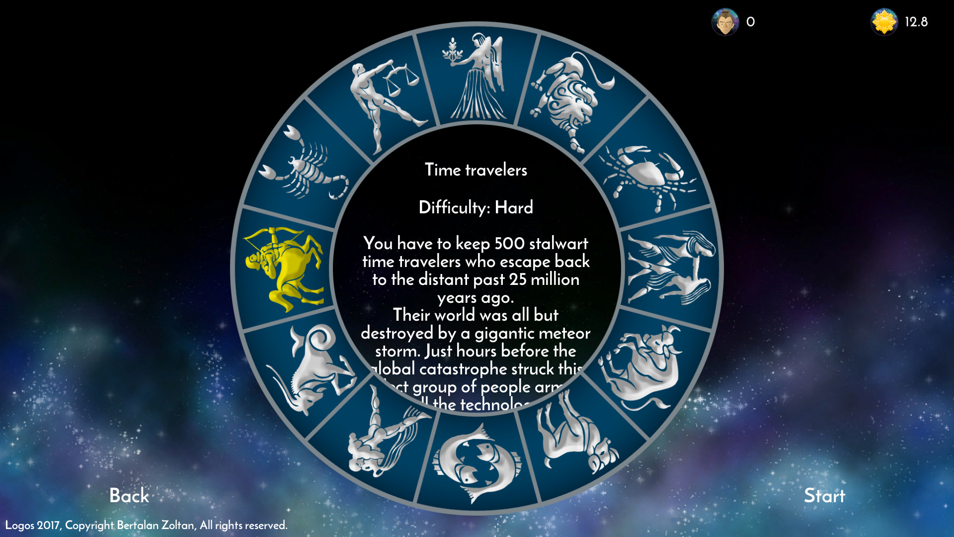 Imagine that You are the Main Logos of the Earth, that is, the ultimate master and commander. Human life is merely just a moment for you. Using the Fate-cards, you are able to lead your people towards their future which is unknown even for you. Your decisions will affect the fate of a whole civilization: the population, reproduction, people's ideas, the technology and also the health of the planet, that is, Mother Earth, which might be endangered by wars, alien civilizations and even armies of undead people. It's in your interest to have more and more people reach the Logos level of perfectness, the primary conditions of which are harmony, ethics and the maintenance of the ecosystem being in service as the living space As the Main Logos, you are of course aware that the planet you dominate serves as a classroom for the billions of Logos, souls hiding in human bodies, but for you this place can be a toy in your hands, which means you can do anything to them that your all-powerful will desires. Keep in mind that there are other Main Logos out there who may compete for you planet, but it's up to you if you give them space or you refuse to take such challenges. Details: Turn based, card strategy game. 25.920 years, 108 years/turn. As Supreme (Main) Logos, you use Fate-cards to develop humanity. Fate-cards impress one turn but are able to impress further development. Ecology, population, birth rate, health, food, resource, conflict, harmony, ethics, battle score change continuously. Wild animals, aliens and even undeads may appear during the entire cosmic cycle (25920 years) In addition, different events may also have an impact on the planet and on humanity. Далее