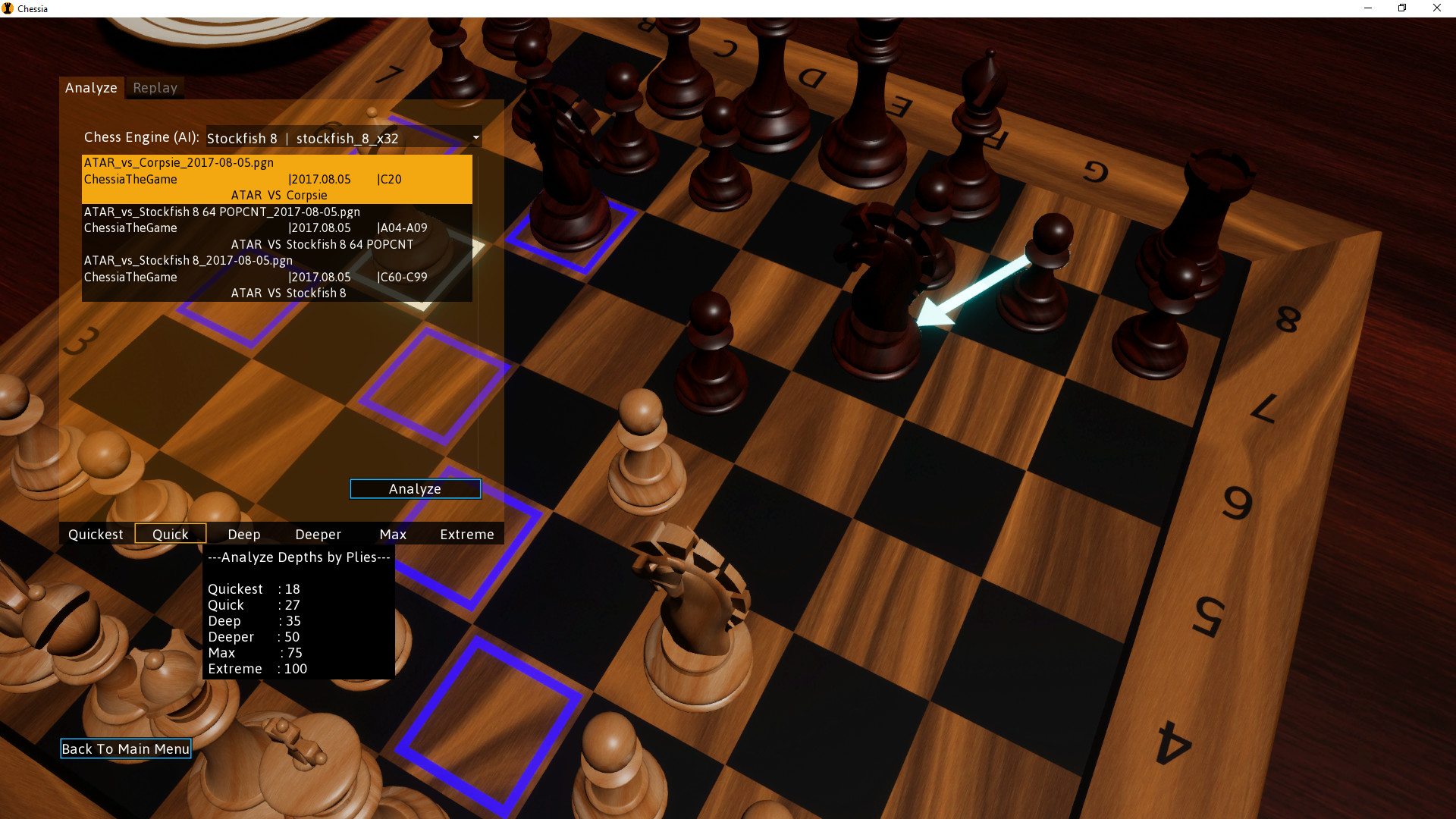 Are you a chess master? Or a chess enthusiast? Maybe you just play chess from time to time. Whoever you are, Chessia is here for you. Play with friends, play against computer, or play against yourself to try things out. Analyze games and many more..FEATURES* Play locally and online with your friends* Play against the computer with 20 levels to chose from (Stockfish 9 is Default)* Smooth 3D controls with possible camera angles (WASD)* Install any chess engine you want (Full UCI support)* Change any chess engine's settings with easy interface, save those settings or reset them to their defaults* Save games in PGN file format. Load and watch games or analyze them with 6 different depths Далее