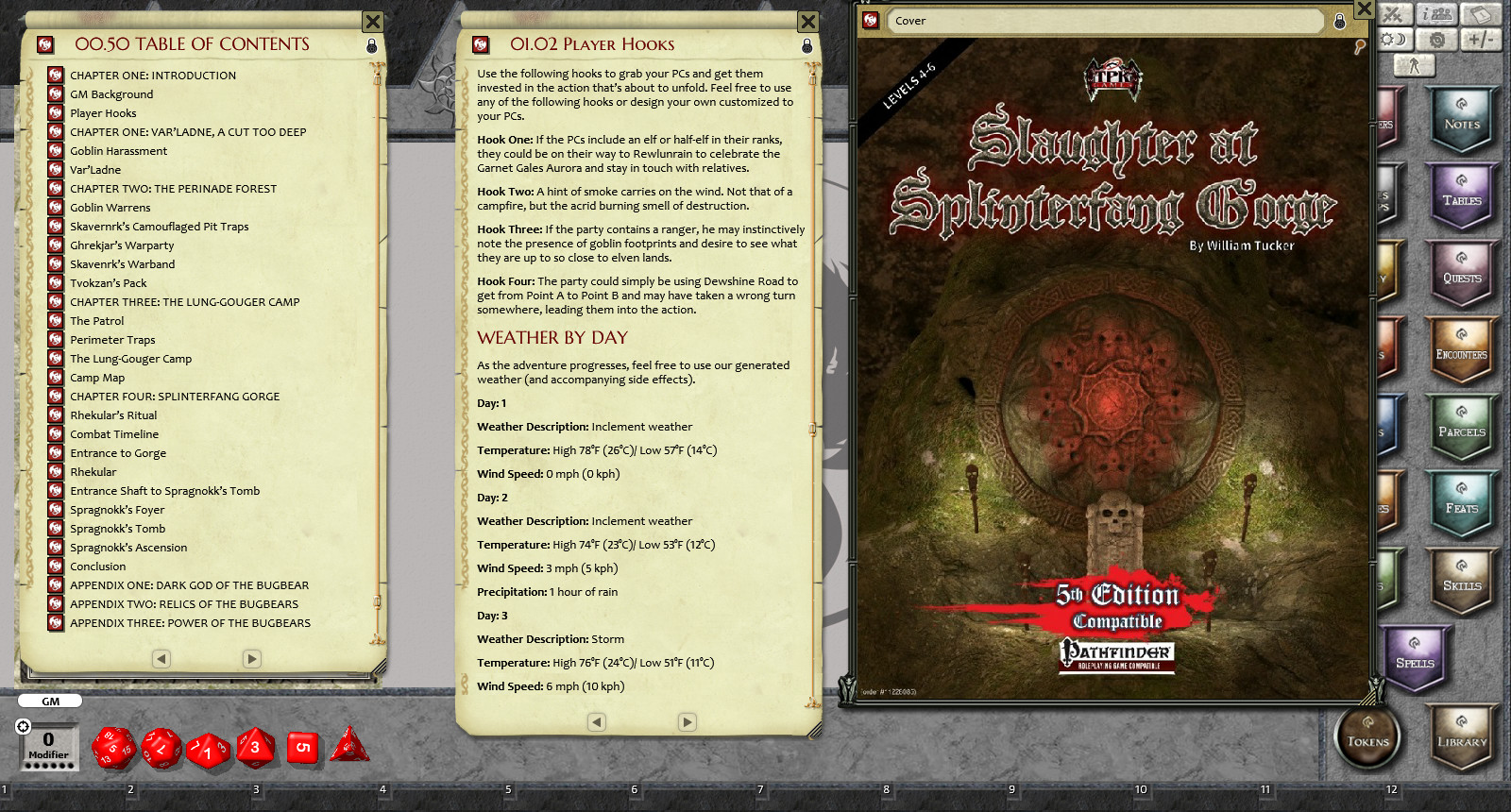 Many years ago a brutal bugbear chieftain united the goblinoid tribes of the Meirlara Forest and nearly wiped out all traces of the elves there within. A stroke of chance fate turned the tide and the dreaded bugbear warlord Spragnokk was defeated. His loyal kin hid his body away in a sealed chamber and then the world forgot about Spragnokk.. until now.Now his bloodline continues, and they have plans to resurrect their fallen "great chieftain," to bring ruin and revenge upon the elves that handed them defeat decades past. The goblinoid tribes have once more been gathered, and their bloody revenge is imminent, except fate has yet once more placed new champions to stand in their way.They just don't realize it yet.Slaughter at Splinterfang Gorge is a challenging adventure for an average party level of 5, but suitable for 4th to 6th level characters. Encounters also include scaling advice to fully challenge more powerful characters.This adventure is fully suitable for the Pathfinder(TM) roleplaying game.Converted to Fantasy Grounds by Rob TwohyReleased on September 02, 2017. Designed for Fantasy Grounds version 3.2.2 and higher.Requires: An active subscription or a one time purchase of a Fantasy Grounds Full or Ultimate license and the included Pathfinder Ruleset (3.5E Compatible). Далее