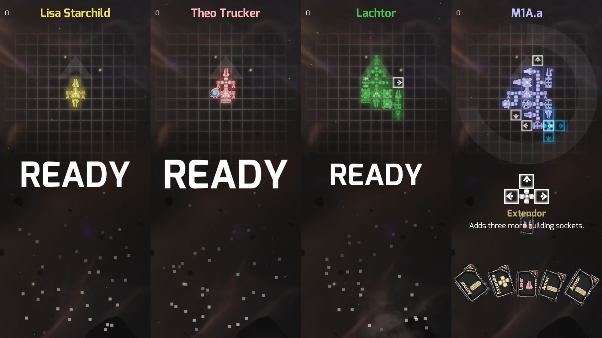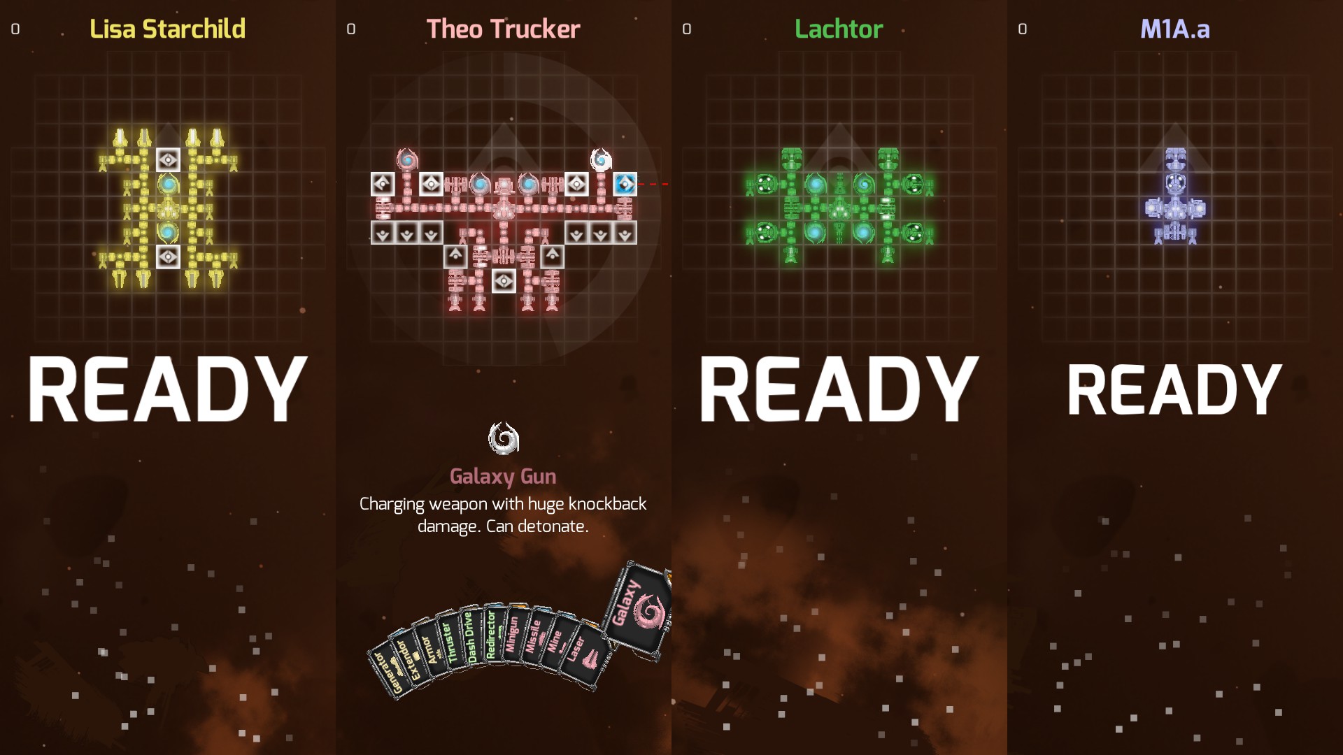 Scrap Galaxy is a local build-and-destroy deathmatch game for up to 4 players. It is a 2D top-down shooter taking place out in space in a galactic junkyard. In this setting, the players are trying to survive by constructing space ships.The game is round-based and each round is divided up into two phases: build phase and battle phase. During the build phase, each player gets a number of components and has to assemble a spaceship from them within a certain time limit. During the battle phase, the players pilot the ships. They battle against the other or team up against the garbage drones living in the junkyard.The randomness and unpredictable nature of the game makes every round into a new challenge, because you always have a new ship to battle with, raising the stakes and making the game quite addictive.Key Features. Creativity under time pressure mixed with action-packed spaceship battles.Deathmatch until only one player remains. A new ship is constructed each round.Scrap King is like Deathmatch but the winner keeps their ship and can continue to build on it.Co-op allows the players to fight together against garbage drones. The players continues to build on their ships after each wave of enemies.Bots fill lasts slots if you are less than 4 people playing.Original soundtrack made by Connor O.R.T. Linning.Numbers. 1 to 4 players playing together in local multiplayer.11 different components to construct spaceships from.3 different game modes.3 different deathmatch rule sets.6 Different maps.10 Co-op levels.Controls. Gamepads are highly recommended for singleplayer and multiplayer. Gamepads tested are Xbox 360 gamepad, Xbox One Gamepad and Steam Controller.Two player can share one full size keyboard and play. Due the the amount of keys involved a mechanical keyboard is recommended to prevent ghosting. Далее