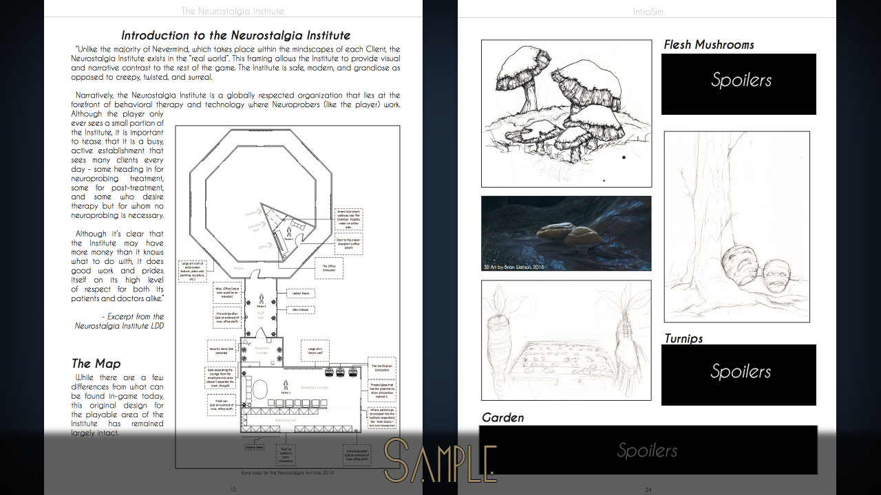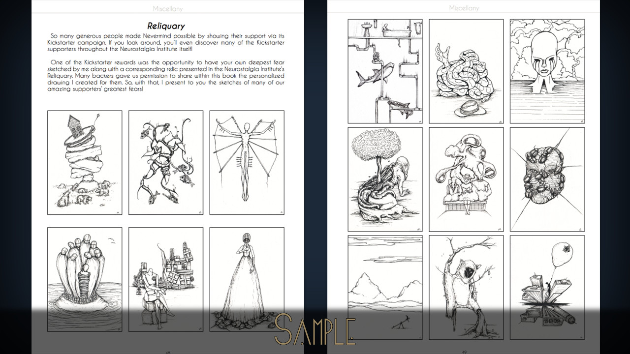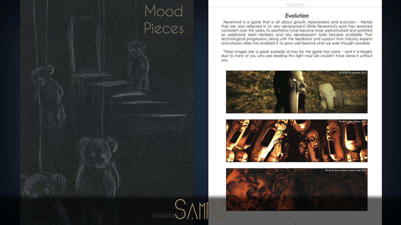 Dive deeper into the world of "Nevermind," through the art that started it all. Creative Director Erin Reynolds reflects on the journey of Nevermind's creation with concept art, in-game images, and stories from behind the scenes.Chapters Include:Mood PiecesThe Neurostalgia InstituteIntroSimClient #251Client #418Miscellany51 PagesPDFTo Access "The Art of Nevermind," Please Follow the Steps Below:1 - Right click "Nevermind" in your Steam Library and select "Properties."2 - Under the "Local Files" tab, select “Browse Local Files.”3 - Within Nevermind's local files, find the folder titled "artbook."4 - The art book's PDF file can be found within that folder. Далее