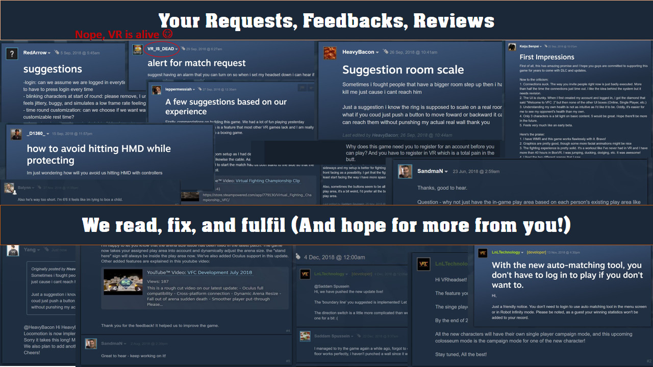 ATTENTION:. Virtual Fighting Championship (VFC) brings the heart-pounding action of classic fighting games like Street Fighter and Tekken into an immersive VR world. With a perfect balance of realism and over-the-top excitement, VFC delivers a combat experience that rewards real-life skills while making every fight dynamic and engaging. Whether you're taking on players from around the world in online matches or perfecting your techniques against a lineup of unique NPC opponents, VFC puts you in control of the action. Each fight is a dynamic, fast-paced showdown where strategy and creativity lead to victory.Easy to pick up but endlessly rewarding to master, VFC offers gameplay for everyone—from casual players looking for fun to competitive fighters aiming for the top. Step into the arena, choose your style, and fight your way in this exciting and highly replayable VR fighting experience. Далее
