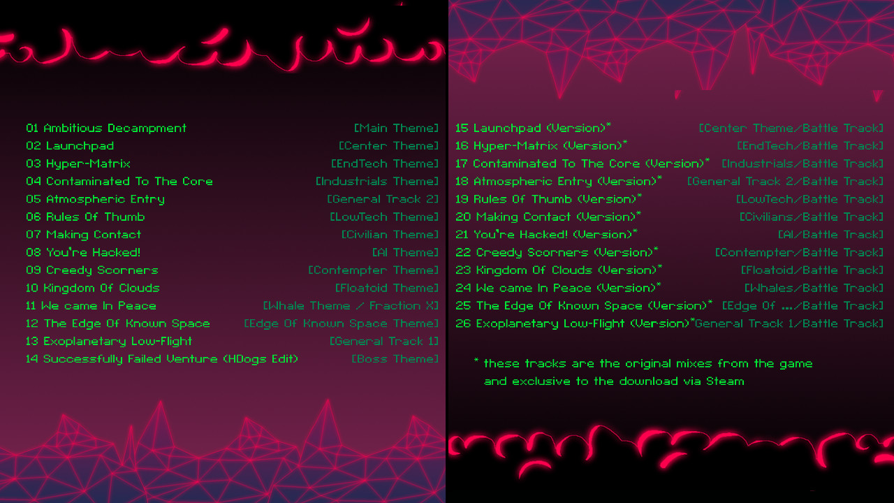 The 'Hyperspace Dogfights Original Game Soundtrack / Steam Edition' is a musical journey into a parallel universe, a journey from intergalactic megacities through marvellous as well as dark and filthy environments to the edge of known space. On this journey you'll encounter various lifeforms. Some exist on the earliest levels of evolution, some are singular experiments of nature, some succeeded in overcoming their genetic evolution resulting into artificial intelligence. There is peace and there is war and aggression. There is greed and dignity. And it's all translated into sound and music. The 'Hyperspace Dogfights Original Game Soundtrack / Steam Edition' contains 26 tracks from Leipzig based Electronica artist and composer ENUIT (Enrico Stenzel), including 12 exclusive tracks originally used in the games battle-modes - only available through the 'Hyperspace Dogfights' Soundtrack – 'Steam Edition'! The main theme “Ambitious Decampment” was created in a collaboration of ENUIT with Isle Of Sound (Ole Toense),- another Leipzig based musician and composer. Track List: 01 Ambitious Decampment 02 Launchpad 03 Hyper-Matrix 04 Contaminated To The Core 05 Atmospheric Entry 06 Rules Of Thumb 07 Making Contact 08 You're Hacked! 09 Creedy Scorners 10 Kingdom Of Clouds 11 We Came In Peace 12 Edge Of Known Space 13 Exoplanetary Low-Flight 14 Successfully Failed Venture (HDogs Edit) 15 Launchpad (Game OST Version)* 16 Hyper-Matrix (Game OST Version)* 17 Contaminated To The Core (Game OST Version)* 18 Atmospheric Entry (Game OST Version)* 19 Rules Of Thumb (Game OST Version)* 20 Making Contact (Game OST Version)* 21 You're Hacked! (Game OST Version)* 22 Creedy Scorners (Game OST Version)* 23 Kingdom Of Clouds (Game OST Version)* 24 We Came In Peace (Game OST Version)* 25 Edge Of Known Space (Game OST Version)* 26 Exoplanetary Low-Flight (Game OST Version)* * these original battle-tracks from the game are exclusive and only available through this 'Hyperspace Dogfights' Soundtrack / 'Steam Edition'! Далее
