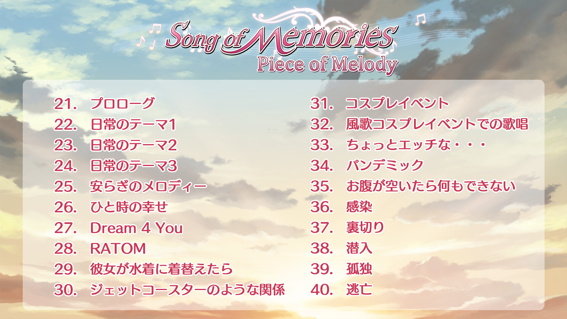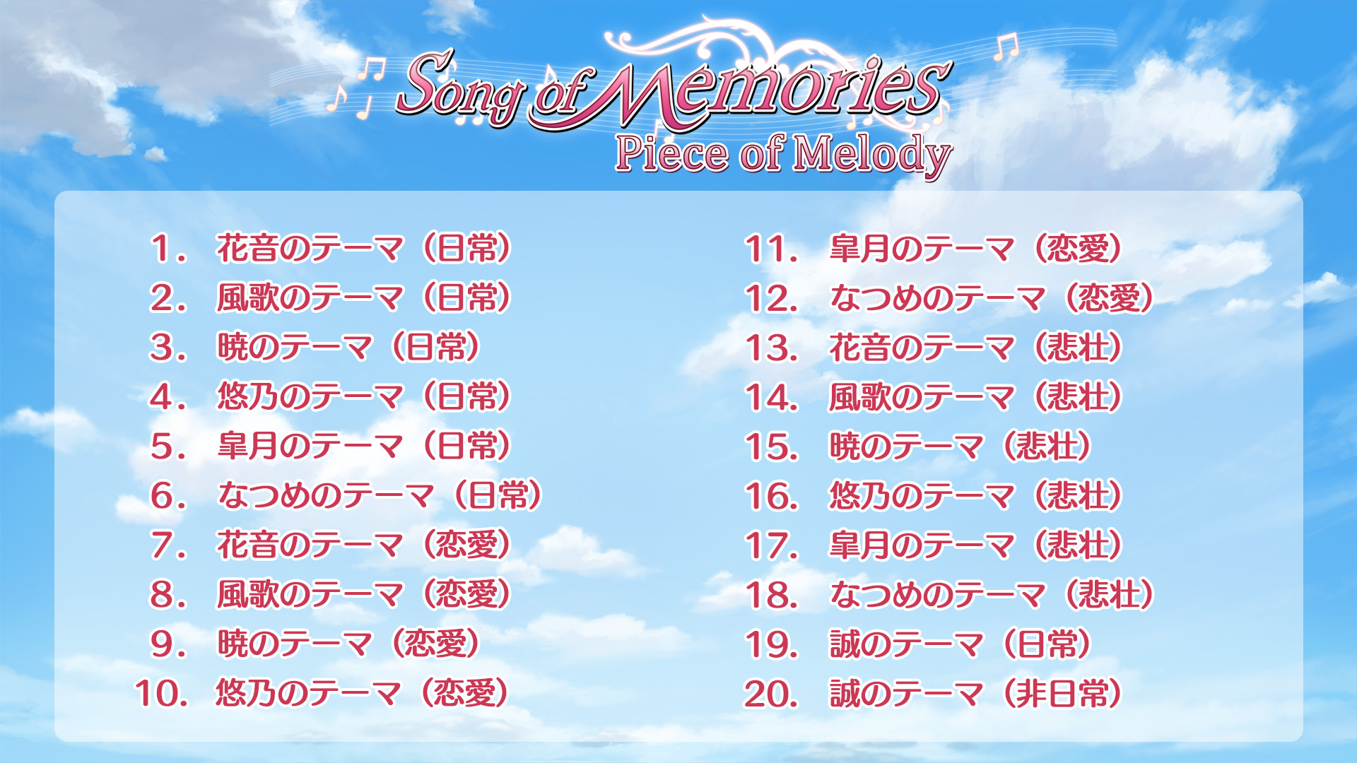It's the original soundtrack of Song of Memories:Song of Memories-Piece of Melody-.■Tracklist(instrumental): 1,Theme of Kanon (Daily life)2,Theme of Fuuka (Daily life)3,Theme of Akira (Daily life)4,Theme of Yuno (Daily life)5,Theme of Satsuki (Daily life)6,Theme of Natsume (Daily life)7,Theme of Kanon (Romance)8,Theme of Fuuka (Romance)9,Theme of Akira (Romance)10,Theme of Yuno (Romance)11,Theme of Satsuki (Romance)12,Theme of Natsume (Romance)13,Theme of Kanon (Painful)14,Theme of Fuuka(Painful)15,Theme of Akira(Painful)16,Theme of Yuno(Painful)17,Theme of Satsuki(Painful)18,Theme of Natsume(Painful)19,Theme of Makoto(Daily life)20,Theme of Makoto(unordinary)21,Prologue22,The daily life123,The daily life224,The daily life325,The healing melody26,A moment of happiness27,Dream 4 You28,RATOM29,Her swimsuit30,Like a roller coaster31,Cospure event32,Fuuka sings on stage33,sexual..34,PANDEMIC35,An army marches on its stomach36,INFECTION37,TREACHERY38,SNEAK39,SOLITUDE40,ESCAPE41,ENCOUNTER42,DANGEROUS SPACE43,NEW-44,Battle:NEW-145,Battle:NEW-246,Level up!47,New song!48,Can't get away from the reality49,CHOICE50,DECIDE51,Conclude..52,Can't choose53,For you..mp3/160kbpsThis DLC is saved on the game file. Далее
