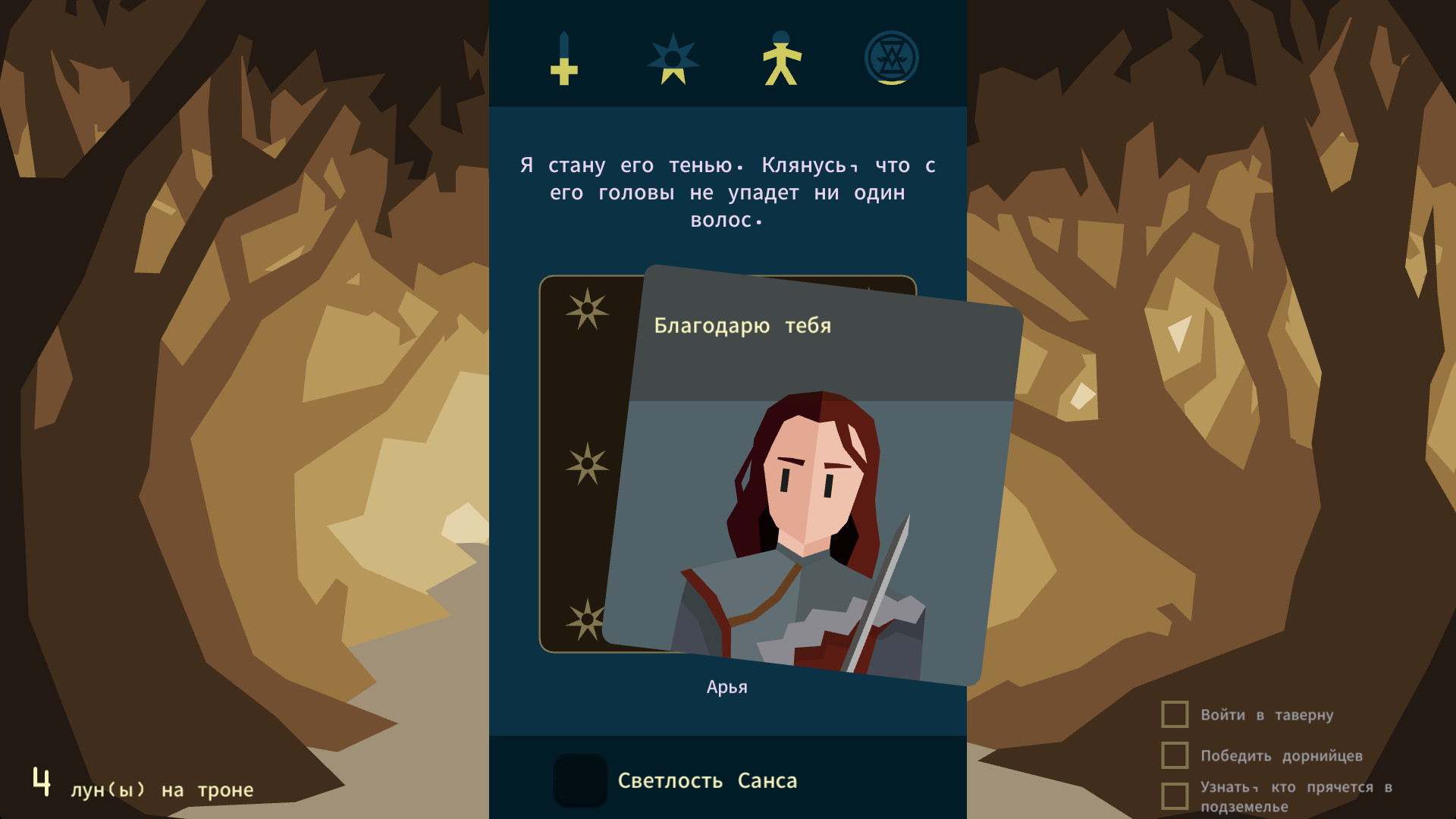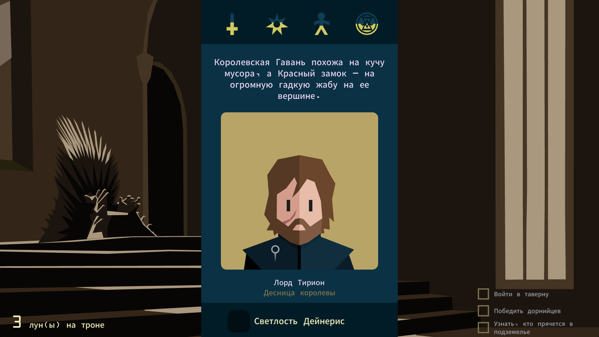 Reigns: Game of Thrones создана на основе знаменитого сериала «Игра престолов®» канала HBO® и хитовой серии игр про принятие решений от Nerial и Devolver Digital. Следуя пламенным пророчествам жрицы Мелисандры, воссядьте на Железный трон в роли Серсеи Ланнистер, Джона Сноу или Дейенерис Таргариен — а может, кого-то ещё? Вам предстоит лавировать в сложных хитросплетениях уз и интриг между враждующими домами Семи Королевств. Только хладнокровие и коварство помогут вам победить политических соперников и водрузить своё знамя над миром, который так часто меняет властелинов. Сохраняйте равновесие и влияйте на людей, чтобы укреплять свою власть — ведь ужасы зимы уже близко. Любимые персонажи: вы можете посадить на Железный трон Серсею Ланнистер, Джона Сноу, Дейенерис Таргариен, Тириона Ланнистера, Сансу Старк или кого-то из многих других. Открывая все новых и новых претендентов на престол, вы будете иметь дело с их тайнами и слабостями, которые у каждого свои. Диктуйте свою волю: принимайте решения и определяйте судьбу Семи Королевств одним движением пальца — вправо или влево. Люди Вестероса обращаются к вам со слёзными мольбами и неожиданными требованиями. А кому из них внимать — решайте сами. Если же кто-то становится слишком назойливым, просто порвите карту этого несчастного пополам. К чему Вашему Величеству отвлекаться на такие мелочи? Правда, у подобных действий бывают последствия.. Перекроите историю Вестероса по своему разумению. Видения Мелисандры покажут вам дороги судеб тех, кто сидит на Железном троне. Даже если вы знаете все серии «Игры престолов» наизусть, альтернативный сюжет может вас удивить. В роли Серсеи восстановите Великую септу Бейлора или узнайте, как сложилась бы судьба Семи Королевств, если бы Санса Старк вышла замуж за Джейме Ланнистера. Королевские развлечения. Даже самым могущественным правителям иногда необходимо не только думать о судьбах державы, но и заниматься более приземлёнными вещами. Иногда приходится отвлечься на рыцарский турнир, а то и на кабацкую драку. Но помните: у всех этих событий будут последствия! Reigns во всем своём великолепии. Поклонники серии получат огромное удовольствие от самой глубокой и проработанной части, которая не просто пересказывает известную историю, но даёт вам возможность пуститься в новые приключения! Тот самый саундтрек. Решайте судьбу Вестероса и его народов под мощный саундтрек Рамина Джавади из сериала HBO. ©2018 Home Box Office, Inc. Все права сохранены. HBO и все соответствующие товарные знаки принадлежат Home Box Office, Inc. Далее