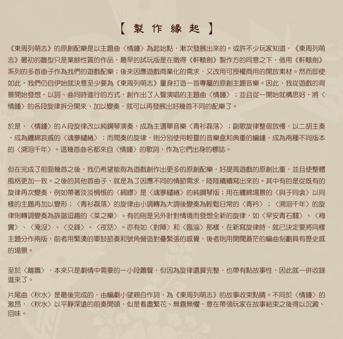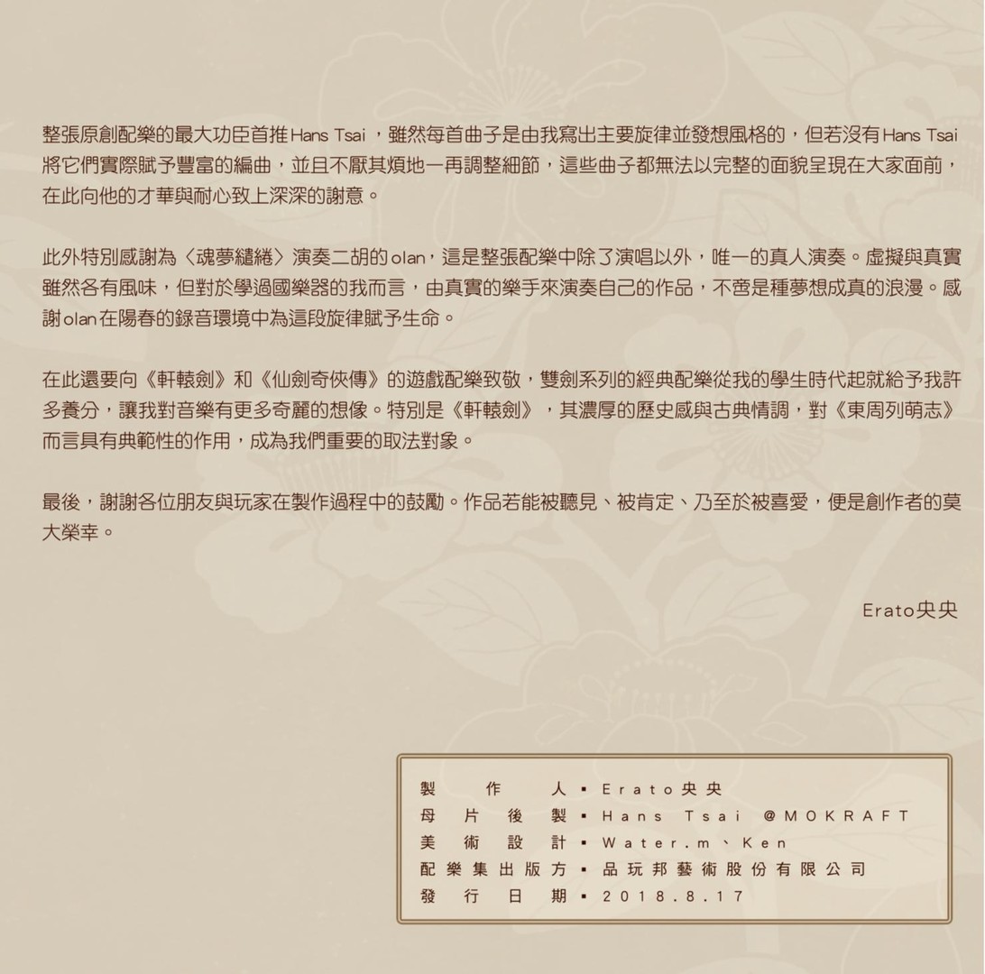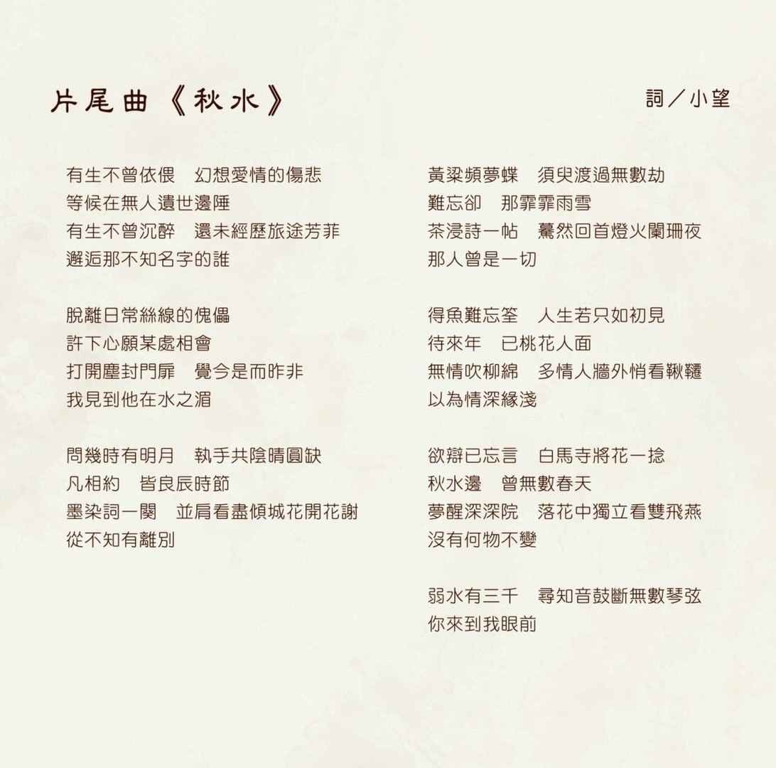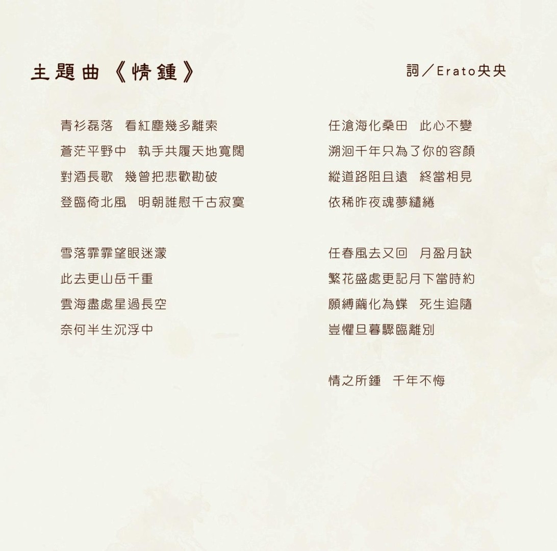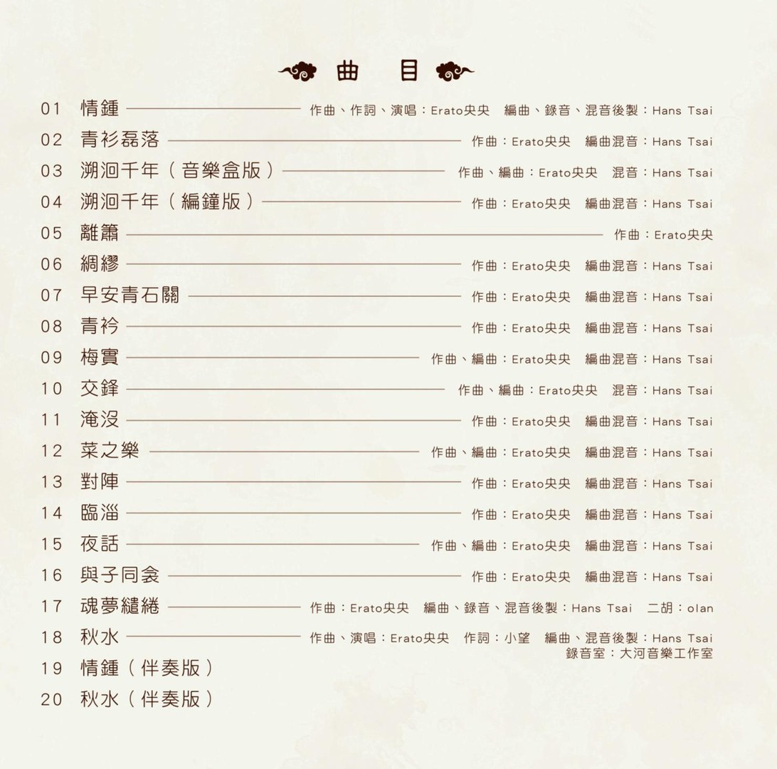曲目列表: 01.《情鍾》 作曲、作詞、演唱:Erato央央/編曲、錄音、混音後製:Hans Tsai 02.《青衫磊落》 作曲:Erato央央/編曲混音:Hans Tsai 03.《溯洄千年(音樂盒版)》 作曲、編曲:Erato央央/混音:Hans Tsai 04.《溯洄千年(編鐘版)》 作曲:Erato央央/編曲混音:Hans Tsai 05.《離簫》 作曲:Erato央央 06.《綢繆》 作曲:Erato央央/編曲混音:Hans Tsai 07.《早安青石關》 作曲:Erato央央/編曲混音:Hans Tsai 08.《青衿》 作曲:Erato央央/編曲混音:Hans Tsai 09.《梅實》 作曲、編曲:Erato央央/編曲混音:Hans Tsai 10.《交鋒》 作曲、編曲:Erato央央/混音:Hans Tsai 11.《淹沒》 作曲:Erato央央/編曲混音:Hans Tsai 12.《菜之樂》 作曲、編曲:Erato央央/編曲混音:Hans Tsai 13.《對陣》 作曲:Erato央央/編曲混音:Hans Tsai 14.《臨淄》 作曲:Erato央央/編曲混音:Hans Tsai 15.《夜話》 作曲、編曲:Erato央央/編曲混音:Hans Tsai 16.《與子同衾》 作曲:Erato央央/編曲混音:Hans Tsai 17.《魂夢繾綣》 作曲:Erato央央/編曲、錄音、混音後製:Hans Tsai/二胡:olan 18.《秋水》 作曲、演唱:Erato央央/作詞:小望 編曲、混音後製:Hans Tsai 19.《情鍾(伴奏版)》 20.《秋水(伴奏版)》 錄音室:大河音樂工作室 Далее