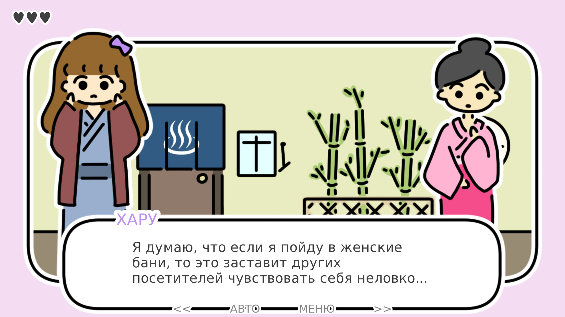 Давняя подруга Хару, Манами, предложила ей провести ночь на горячих источниках. Всё чего хочет Хару - это насладиться пребыванием как все, но она не хочет создавать никаких проблем.. ONE NIGHT, HOT SPRINGS это визуальная новелла. Сыграйте за Хару, молодую трансгендерную девушку и присоединитесь к ней на горячих источниках в Японии. Внимание: Эта игра не имеет возрастного ограничения, однако в ней описываются проблемы с которыми трансгендерная девушка может столкнуться в Японии, что может являться деликатной, болезненной темой и даже чем-то "личным". Также, имейте в виду, что действие происходит в Японии и персонажи - японцы. Длительность игры составляет примерно 30 минут и предлагает семь различных концовок. Далее