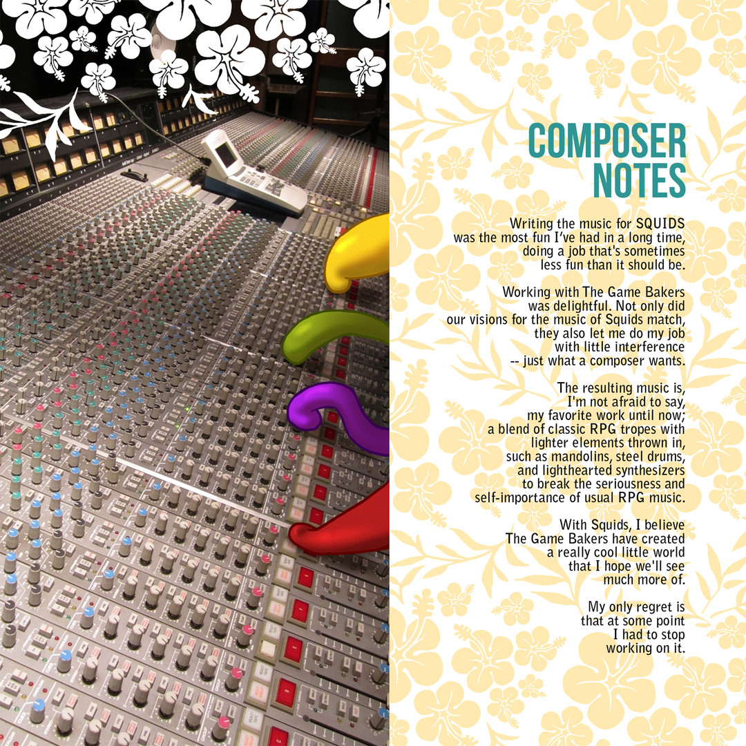 Squids Odyssey Original Game Soundtrack by Romain Gauthier The complete music collection from Squids Odyssey, plus previously unreleased tracks related to the digital comic "Squids - The Edge of the Sea", the canceled animated series, unused bits, sketches, and more. 46 tracks, more than 80 minutes of music. Available in MP3 and FLAC. Track list : 1. Squids Launch Trailer 01:12 2. The Beginning 01:17 3. The Casual Adventure 04:20 4. Turtle Carnage 04:27 5. Mollusc Warfare 03:59 6. Thalas The Great 03:19 7. All Is Well 01:55 8. Squids Theme 03:13 9. A New Chapter 00:12 10. The Wet West 01:29 11. The Bigger Adventure 05:13 12. Calamari Cavalry 02:12 13. Seawood 02:45 14. Tales of the Ocean 00:59 15. The Wild Hunch 03:30 16. What It's About 02:00 17. Pale Hunter 02:38 18. Unpleasant Encounter 00:24 19. Baron 01:21 20. Spirit of the West 01:22 21. Bitter 00:10 22. Return to Thalas 06:16 23. Wakame no Sensō 01:32 24. Wakame Battle 05:11 25. You Plain Fools 00:32 26. The Lost and the Damned 04:49 27. Fade to Black 01:24 28. Squids Theme - Wild West 02:46 29. JINGLE - Victory 00:10 30. JINGLE - Defeat 00:07 31. BONUS - Halloween Special Mission 04:04 32. BONUS - The Edge of the Sea (digital comic) 01:00 33. BONUS - WiiU channel loops 01:44 34. BONUS - TV Series - Previously On Squids 01:30 35. BONUS - TV Series - Saloon 00:34 36. BONUS - TV Series - End Credits 00:46 37. BONUS - The Wild Hunch (no drums no guitars) 03:18 38. MISC. - Evolution of a Track - Calamari Cavalry pass 1 00:53 39. MISC. - Evolution of a Track - Calamari Cavalry pass 2 01:12 40. MISC. - Evolution of a Track - Calamari Cavalry pass 3 01:12 41. SKETCHBOOK - The Lost and the Damned 00:44 42. SKETCHBOOK - Squids Theme 01:21 43. OFFCUTS - Edge of the Sea, rejected title demo 01:19 44. OFFCUTS - The Bigger Adventure 1 00:29 45. OFFCUTS - The Bigger Adventure 2 01:00 46. OFFCUTS - Squids Theme alternate intro 00:20 (c) Romain Gauthier 2018, All rights reserved. All music composed, arranged and produced by Romain Gauthier in Tokyo, Paris, Barcelona and other places. Mastering by Elmobo at Conkrete Studio. Cover art by Jérôme Reneaume. Далее