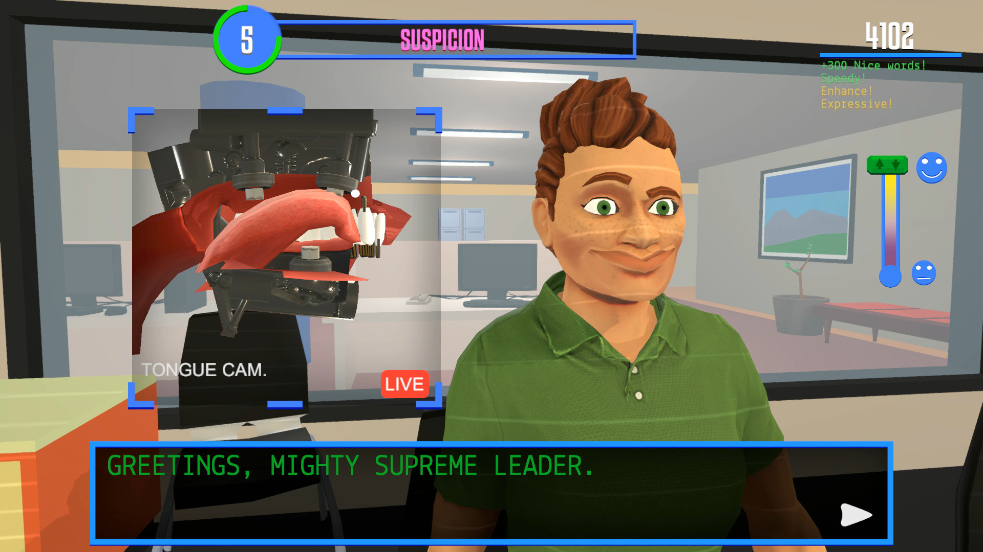 Речь — дело непростое. Вы имеете хотя бы отдаленное представление о человеческом взаимодействии? Тогда эта игра для вас!Вам поставлена задача внедриться в общество доверчивых людей, пообщаться с ними и убедить их, что вы совсем не робот.Омерзительное искусство речевого общения — загадка для нас. Но факт остается фактом: шевеля мокрым языком и растягивая губы, люди способны произносить слова.Как это работает? Мы не знаем. Вам придется освоить этот процесс. Не медлите, иначе ваше лицо взорвется от напряжения.Помните: ошибки приводят к перегрузке системы и запуску одной из многочисленных программ сброса давления, из-за которых ваше лицо может вести себя.. странно. К сожалению, в связи с экономическим кризисом мы были вынуждены урезать расходы на системы безопасности.Постепенно совершенствуя технологию, вы научитесь улыбаться в ответ на что-то хорошее и хмуриться в ответ на что-то печальное. Зрительный контакт не менее важен: если вы не отрываясь смотрите людям в глаза с широкой улыбкой, когда они рассказывают грустную историю, они начинают что-то подозревать.Особенности игры. Отработайте 10 социальных сценариев, среди которых есть собеседование, надгробная речь, медосмотр и свидания.Улучшайте себя с помощью новейших достижений технологии общения. Научитесь улыбаться, поднимать брови и смущенно отводить взгляд как настоящий человек.Самая реалистичная из бредовых систем в истории игр: динамическая аудиосистема, реагирующая на движение языка и рта.Реиграбельность: благодаря огромному разнообразию лицевых взрывов каждый разговор становится уникальным и забавным по-своему.Поразительная наглядность работы языка и откалиброванная система выделения слюны.Звуковое сопровождение, которое меняется в различных частях диалога.Проработанные диалоги и увлекательное повествование.Опуститесь на самое дно и примите участие в танцевальном обряде человеков.Выбирайте внешность по своему усмотрению.Удивительно точное изображение социофобии. Далее