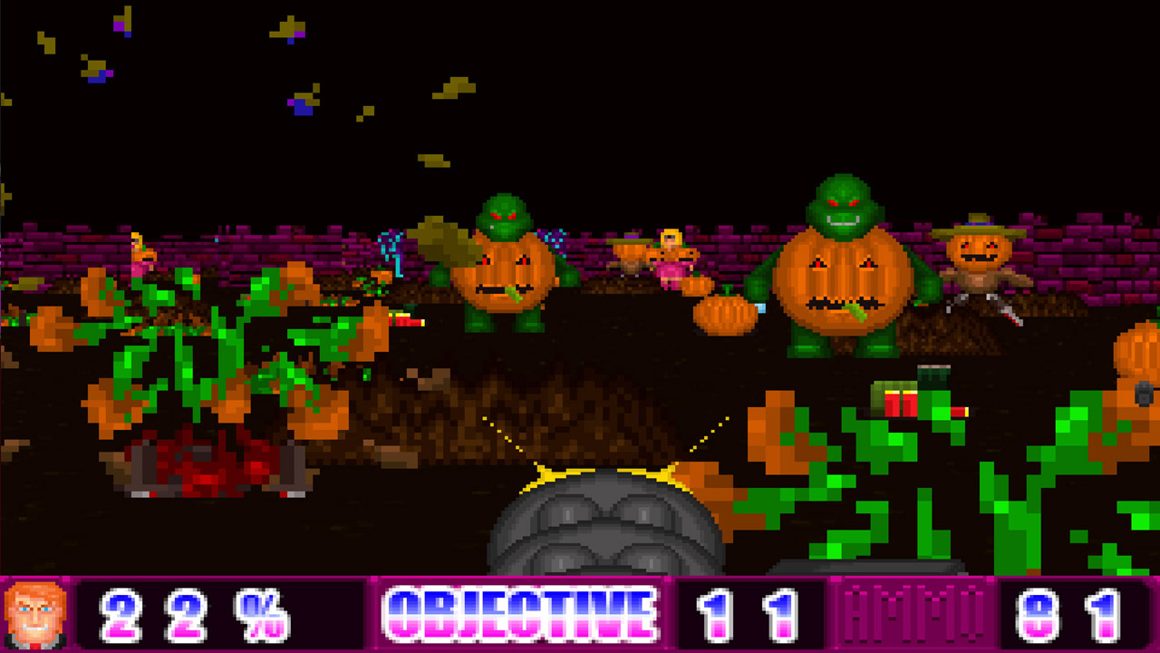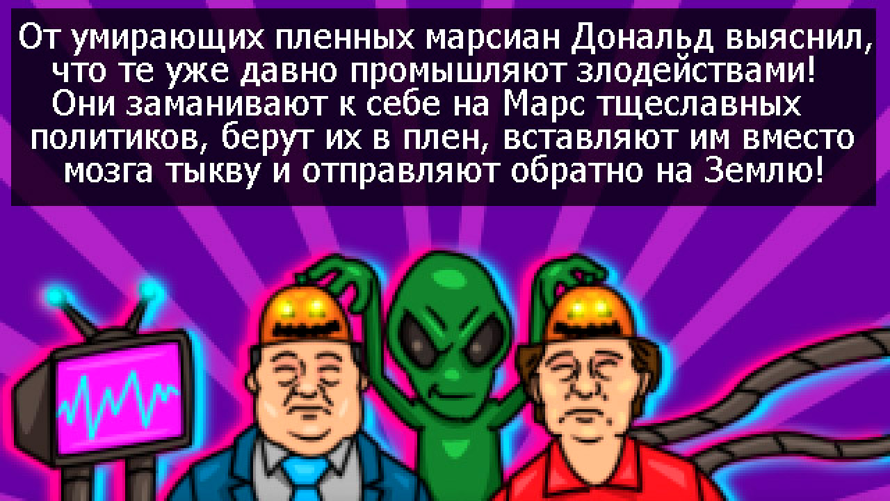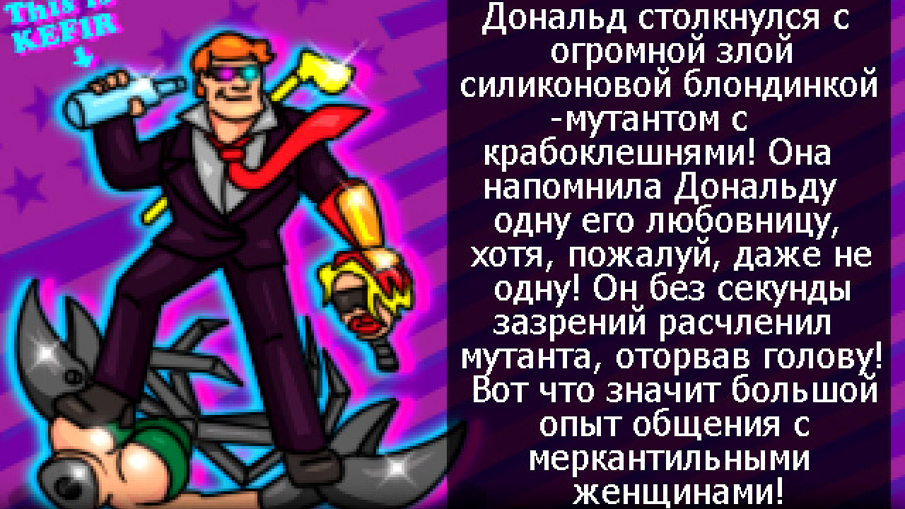 Дональд отправляется мочить космических проституток на Марс, но, неожиданно, на всех нападают тыквы-убийцы-мутанты. Что делать не понятно, где свои где чужие тоже, кровь, кишки и насилие на каждом шагу!В игре вас ждут:- Уникальные виды оружия: оторванная голова наглой блондинки, двойной гамбургер и рука металлического человека. - Самые жуткие враги за всю историю жанра: черепашка-тыква, краб блондинка из Майами, а так же самый знаменитый Российский Стилист!- Только в этой игре Дональд пьет кефирчики, чтобы взбодриться!Несгибаемый Дональд не идет на компромиссы, он спасает галактику! Далее