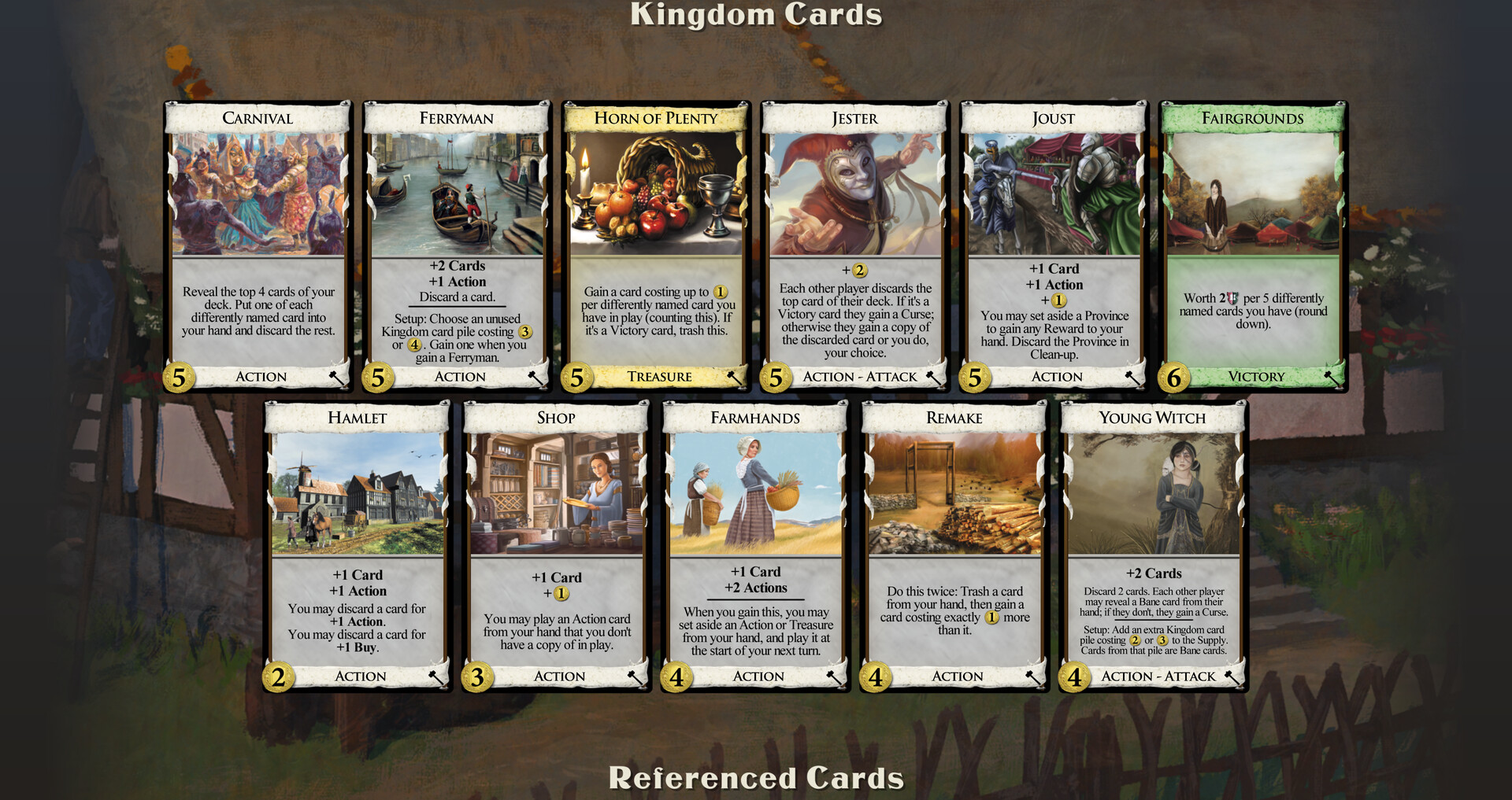 A small expansion with a "variety" theme, with cards that either help you get variety into your deck, or reward you for having a variety of cards. Includes Tournament, which gives players access to otherwise unobtainable Prizes.In games using Young Witch, a random additional Kingdom card pile, costing 2 or 3, is added to the supply. This card is the "Bane," and can be used to respond to Young Witch.In games using Tournaments, five Prize cards are available. These are not in the Supply.Flavor. Autumn. It seemed like the summer would never end, but that fortune teller was right. It's over. Autumn, the time of the harvest. Agriculture has advanced significantly in recent years, ever since the discovery of the maxim, “leaves of three, let it be.” Autumn, a time of celebration. The peasants have spent a hard week scything hay in the fields, but tonight the festivities begin, starting with a sumptuous banquet of roast hay. Then, the annual nose-stealing competition. Then you have two jesters, one who always lies, one who always tells the truth, both hilariously. This celebration will truly have something for everyone.-- Donald X. VaccarinoFeatures. 19 Unique cards - small sized expansion13 Kingdom cards7 Variety theme cards6 RewardsMedium complexity Далее