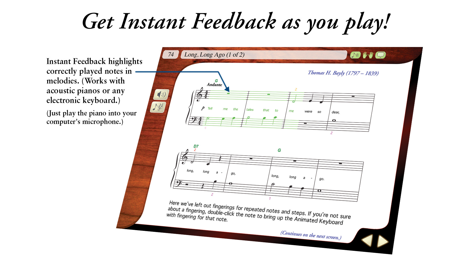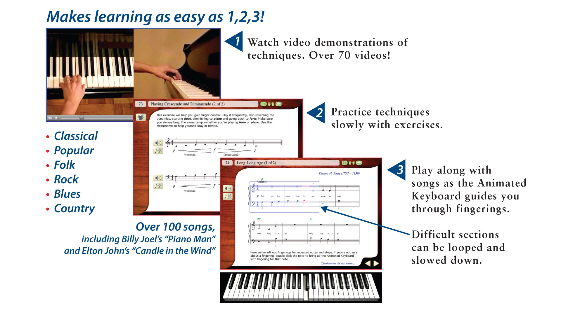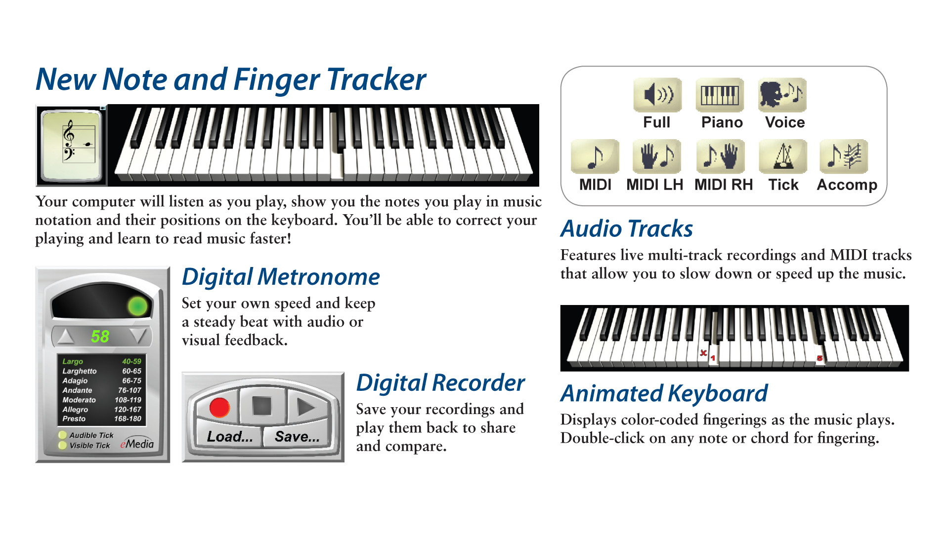 Over 300 easy-to-follow, step-by-step piano lessons from Irma Irene Justicia, M.A., who has taught at the renowned Juilliard School of Music. Innovative Interactive Feedback technology shows you whether you are playing correctly.Learn how to read music, play piano chords and much more with this complete method. Over 100 easy piano songs including hits from Billy Joel and Elton John make learning how to play piano fun!Features include:eMedia's Animated Keyboard that lets you see fingerings for all of the piano lessons, including piano chords, piano scales and songs.Interactive Feedback with Note and Finger Tracker to allow the piano software to listen as you play melodies and display your playing accuracy - a great tool for beginner piano instruction that works with both electronic keyboards and acoustic pianos.Interactive Performance Evaluation in the piano software, which highlights your playing mistakes and shows what you should have played with an overall score (MIDI keyboard required).Lessons on piano basics like how to read piano music, playing accompaniments with piano chords, piano scales, and more.Over 70 videos for the piano lessons are included. Split screen views show you how to play piano fingerings and use correct hand positioning.Piano lessons include easy piano songs as both audio and MIDI tracks where selections can be looped, slowed or sped up.Instrumental accompaniment for select pieces (including orchestral and jazz) to make piano lessons fun.A digital metronome to keep you on rhythm and a recorder to help gauge progress and share your playing with others.100 popular classical, blues, pop, and rock songs let you learn how to play piano with hit songs such as Billy Joel's “Piano Man,” Bob Dylan's “Knockin' on Heaven's Door,” and Elton John's “Candle in the Wind”.eMedia Piano and Keyboard Method is the perfect piano tutorial for learning how to play piano. Even if other beginner piano lessons seemed difficult, this piano software and its interactive approach will keep you engaged and quickly teach you how to play piano well! Далее